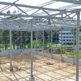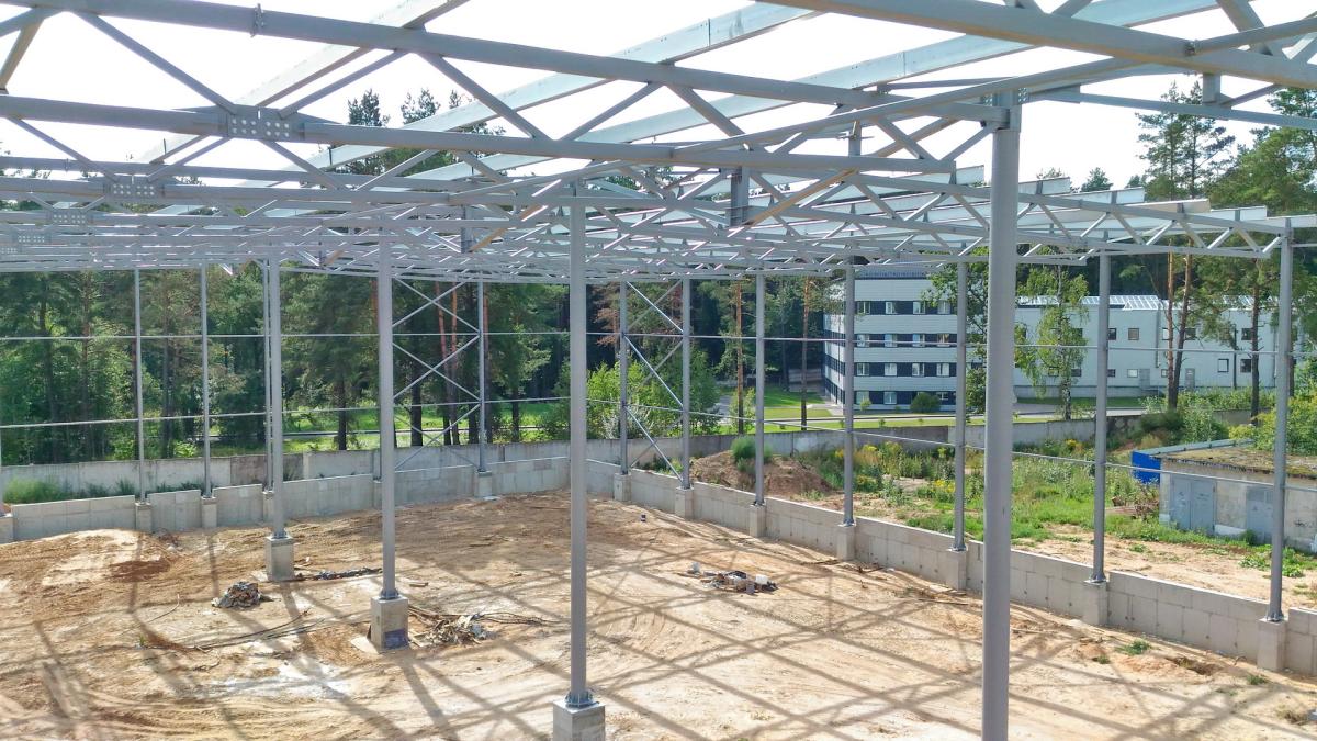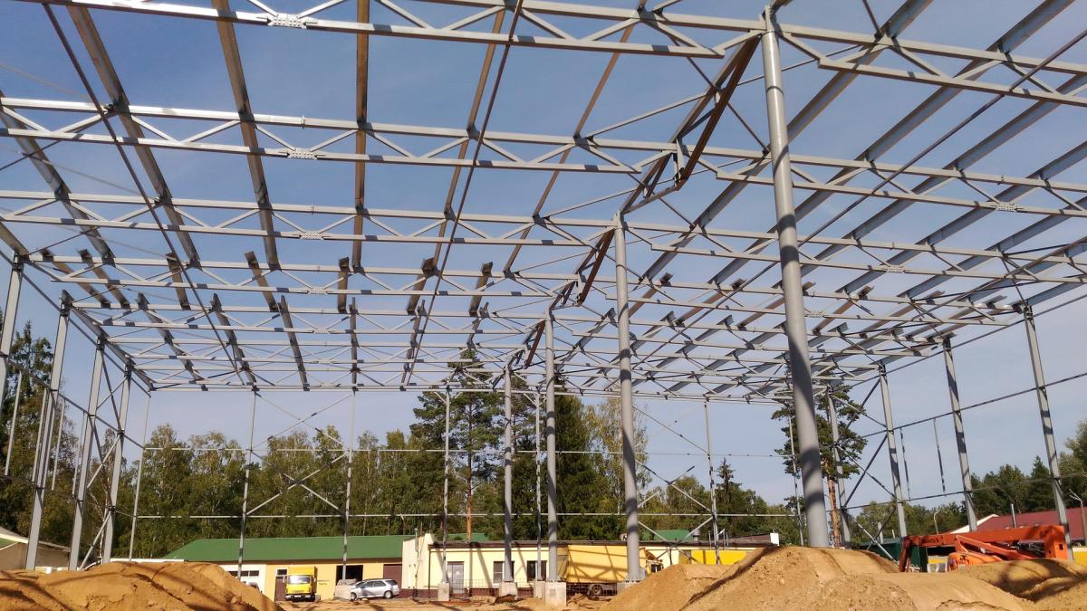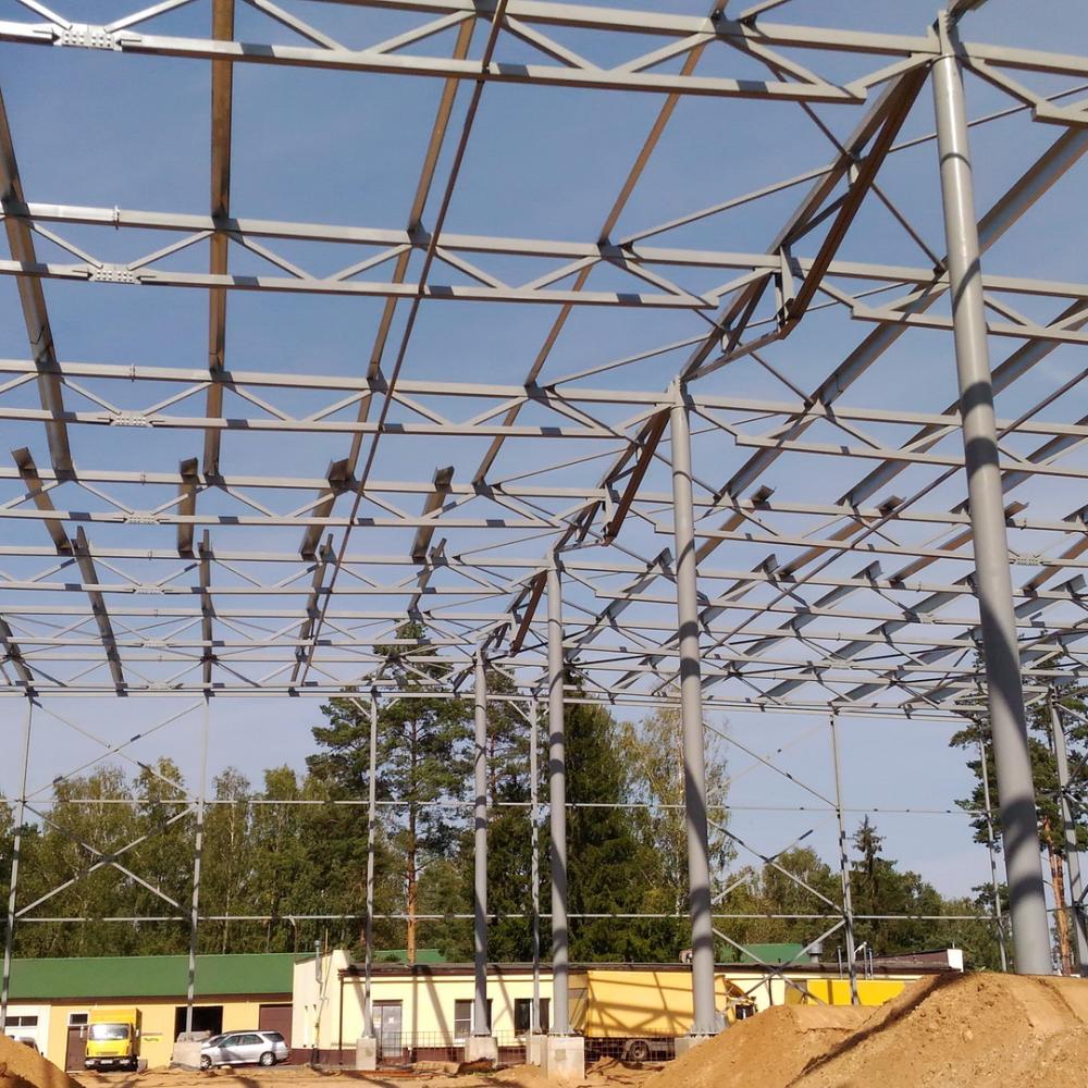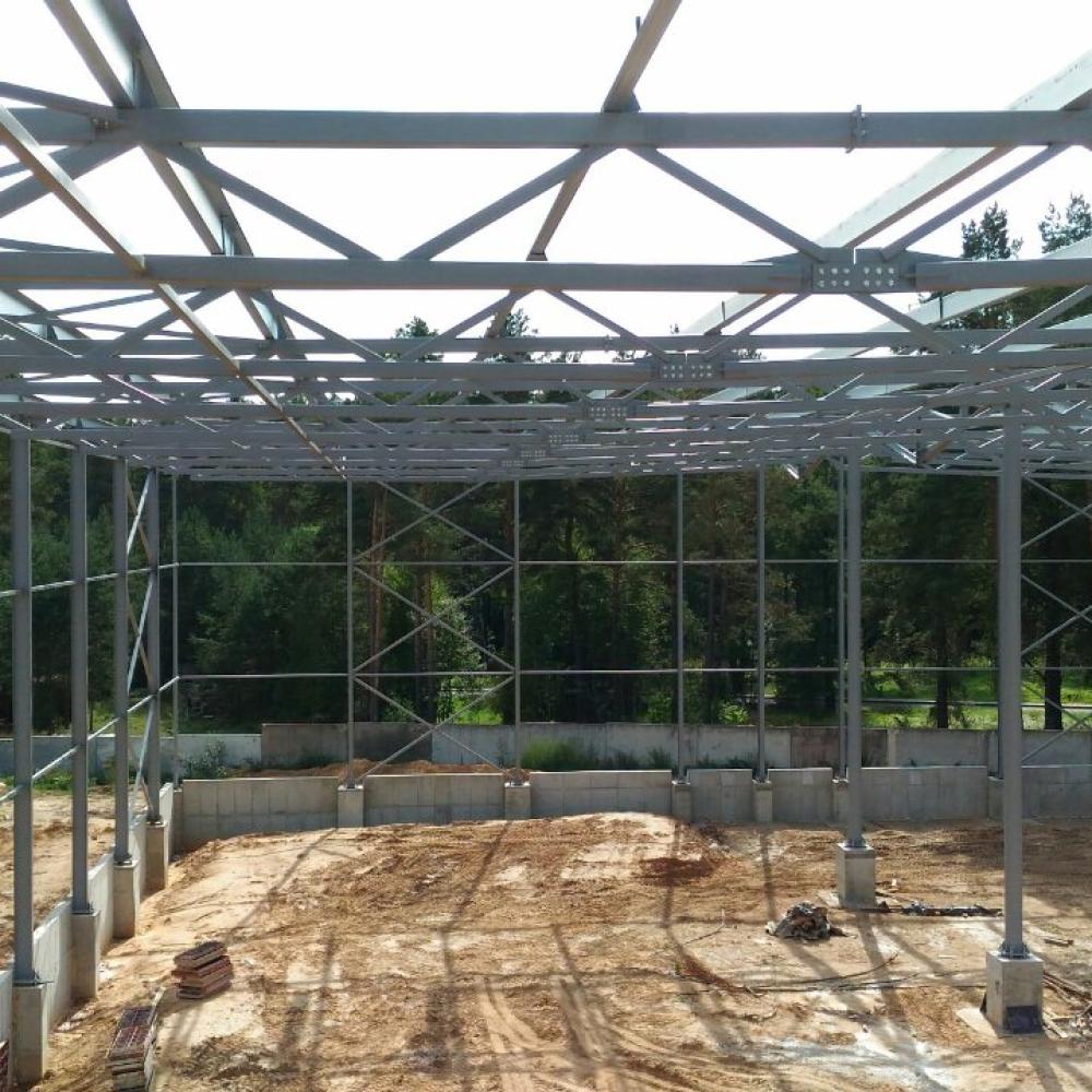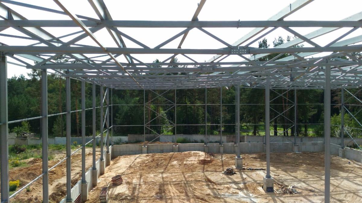 Выполнено проектирование (разделы КМ, КЖ), изготовление и монтаж каркаса здания склада. Особенностью конструктивного решения является пониженная высота стропильных и подстропильных ферм, очертание ферм и колонн повторяет очертание двутавровых сварных рам переменного сечения. Пониженная высота позволяет уменьшить объем здания, что снижает эксплуатационные расходы, в т.ч. при отоплении. Применены холодногнутые оцинкованные профили по ТУ BY 691607213.001-2018 собственного изготовления. Использованы профили типа ПГС и ПГZ: ПГС250, ПГС350, ПГZ250 (PGZ250), ПГZ350 (PGZ350) и др.
